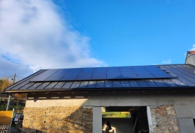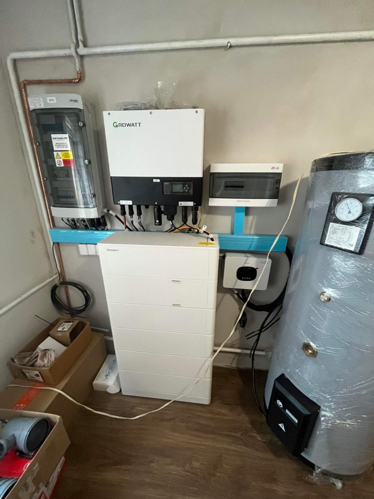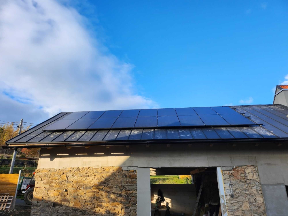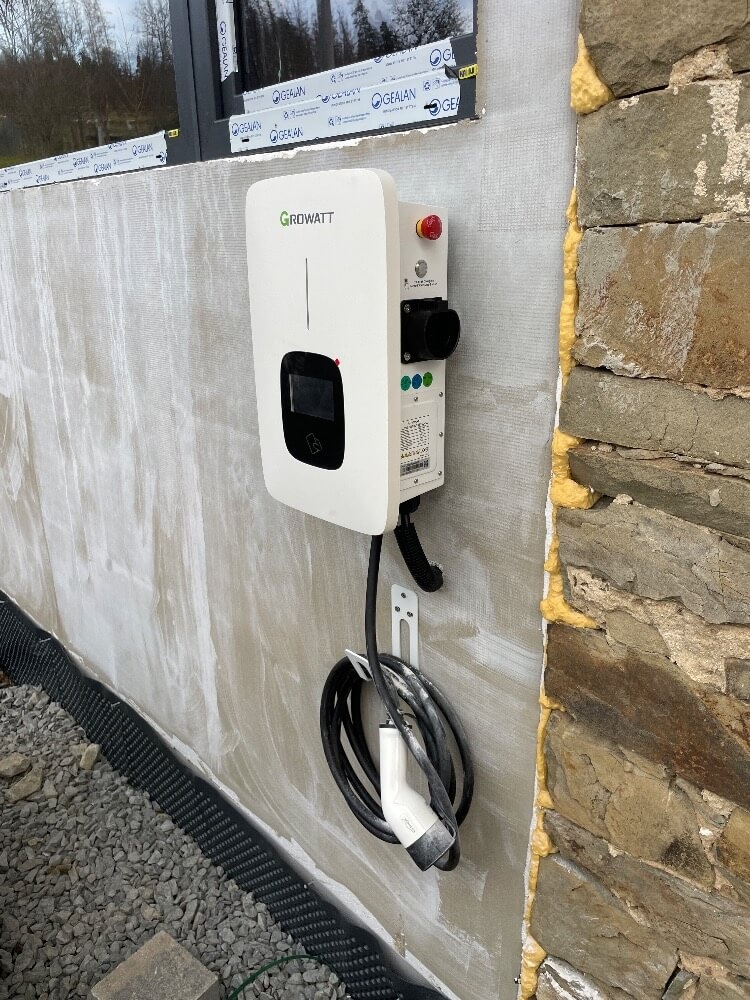 Výkon FVE 6,66kWp, baterie 12,80 kWh, střídač GROWATT SPH8000TL3, FV panely - 18ks Ja SOLAR 370Wp, auto-nabíječka THOR 22AS-P 11kW, Groboost – přetoky z FVE do vody.