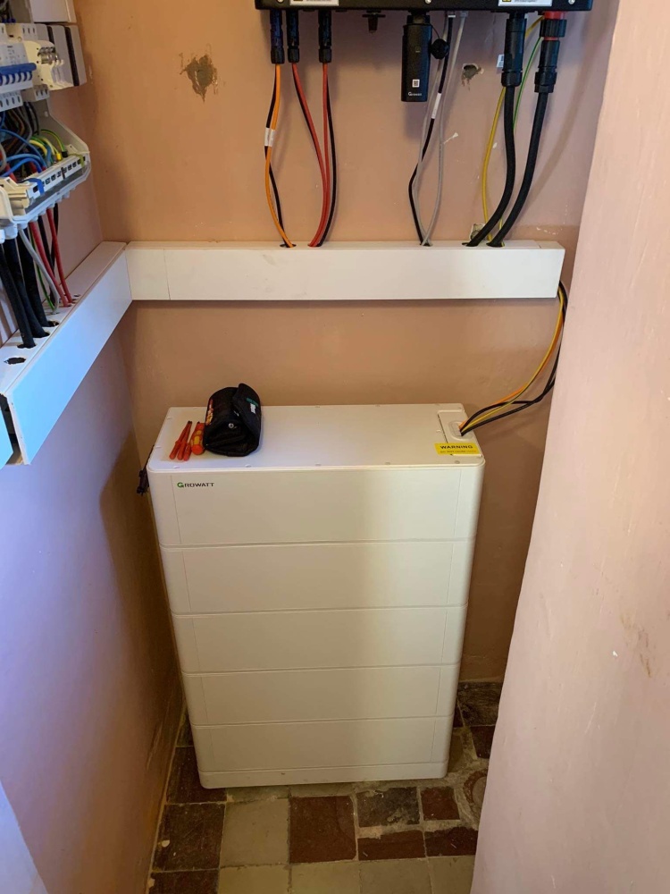 • Výkon FVE 9,56 kWp, baterie 10,24 kWh, střídač GROWATT SPH10000TL3, FV panely -21 ks Ja SOLAR 455 Wp, optimizéry TIGO, Growatt Groboost – přetoky do vody