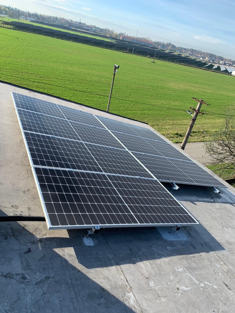 • Zde instalace FVE na mírnou sedlovou střechou s PVC krytinou – důraz kladen na perfektní utěsnění kotevních bodů