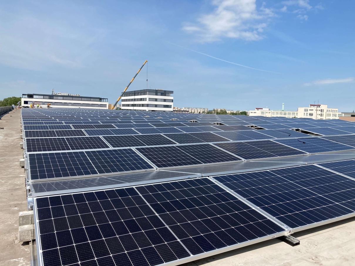 Na střeše jsme instalovali 1 750 panelů s optimizéry a 6 střídačů SolarEdge, doplněných o DC/AC rozvodnice a napojení do přípojného bodu. Zajistili jsme také přeložení hromosvodů a sladili rozmístění panelů s technologiemi klimatizací.