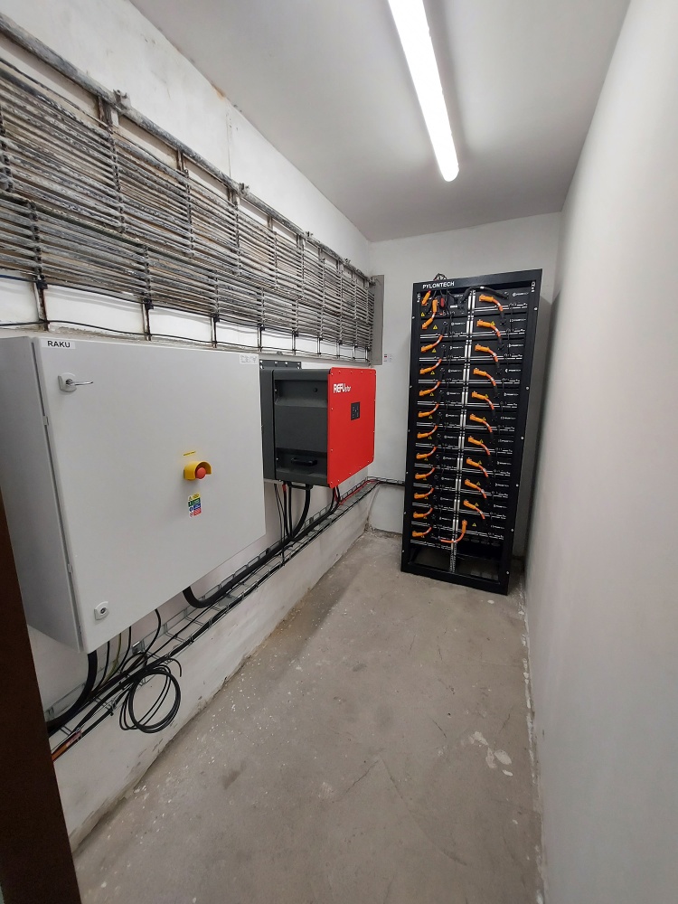 • Fotovoltaické panely v počtu 216 ks o výkonu 460 Wp jsou umístěny na střeše budovy. Celkový výkon FV panelů je 99,36 kWp. FV panely jsou osazeny na hliníkové konstrukci na sedlové střeše s krytinou z trapézového plechu orientace na jihozápad. Součástí výstavby je bateriové úložiště s kapacitou 104 kWh