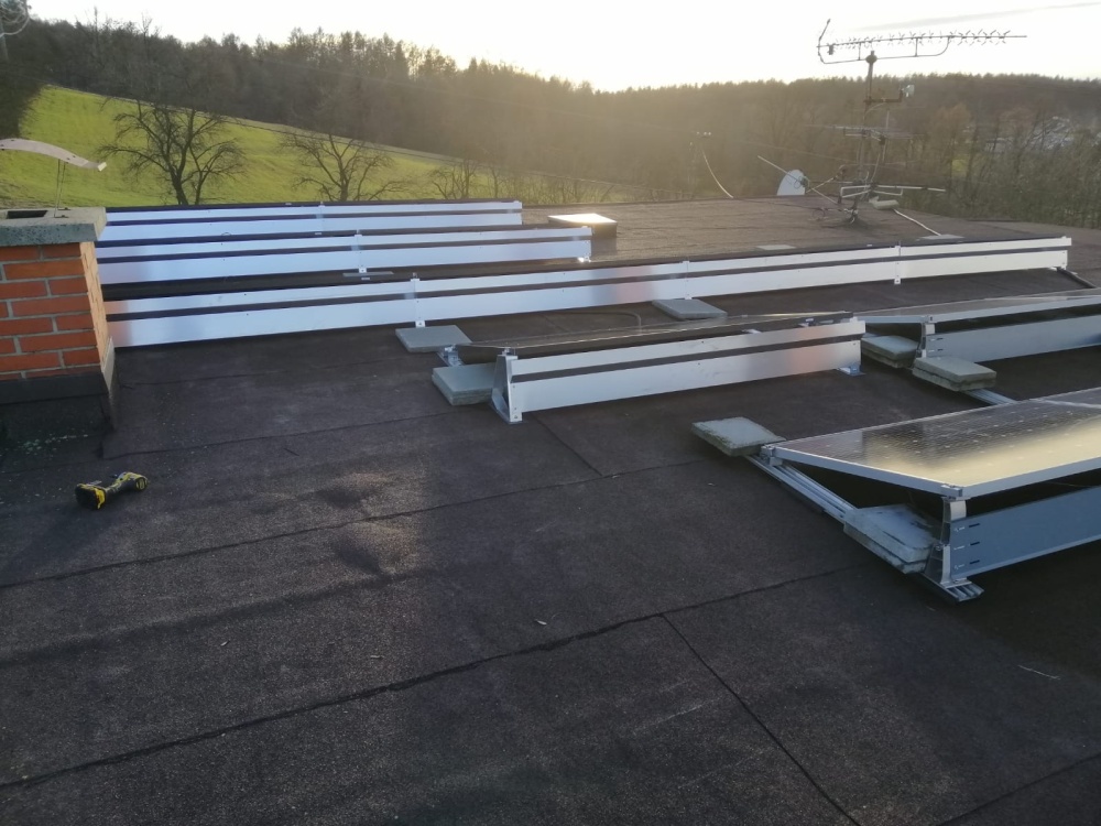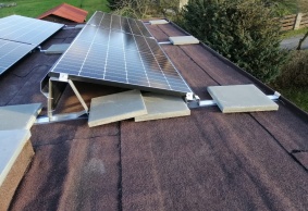 • Podle přání zákazníka na maximální výkon FVE byla provedena montáž FV panelů na 2 samostatné střechy (RD a garáž) – propojení stringů a umístění technologie bylo realizováno v RD